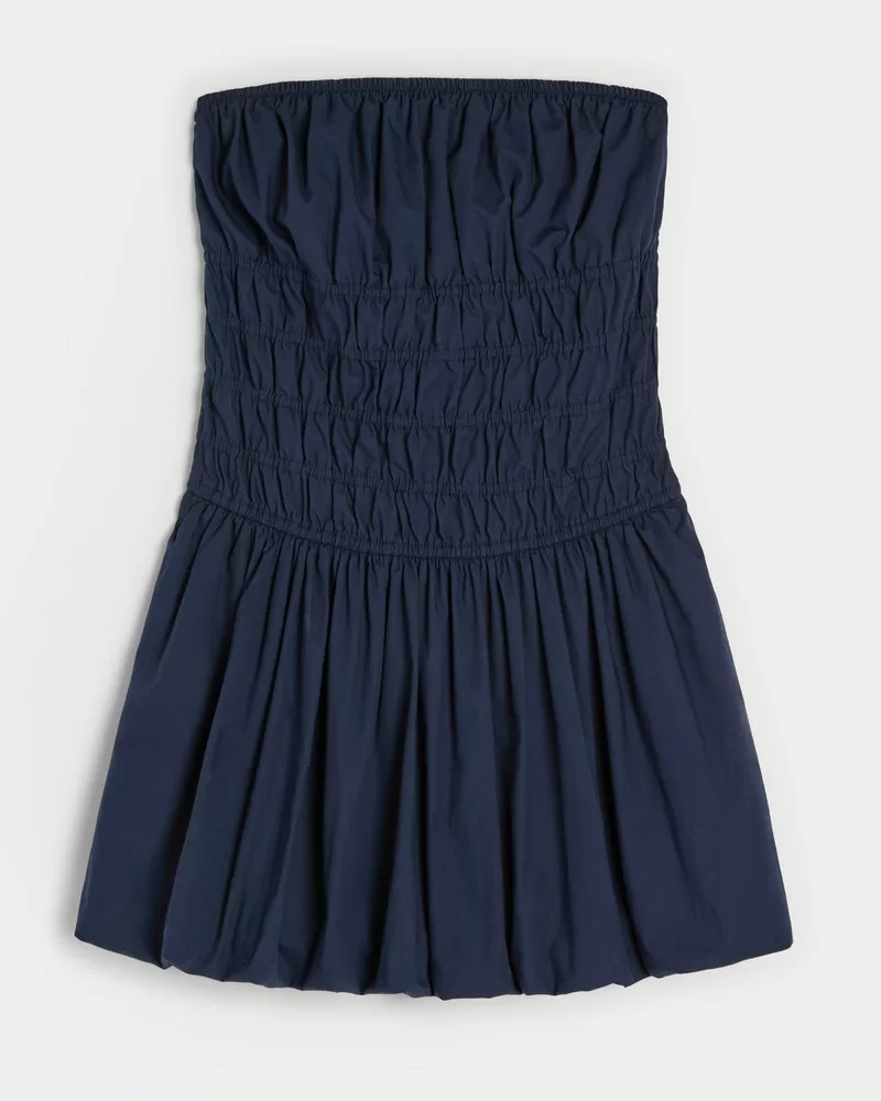 A pretty and super soft mini dress with a channeled waist and bubble skirt. Strapless.