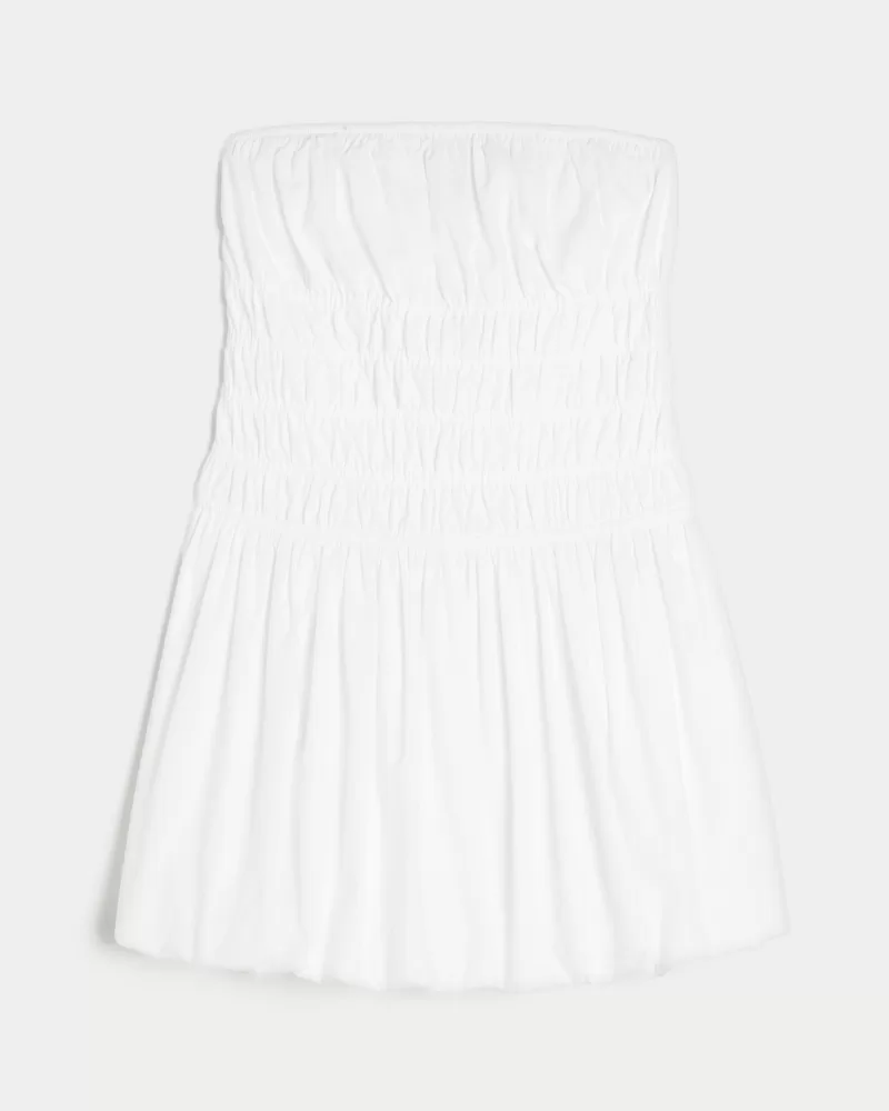 A pretty and super soft mini dress with a channeled waist and bubble skirt. Strapless.