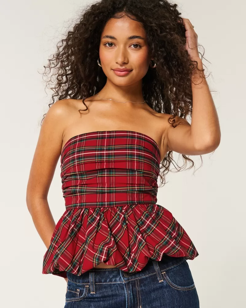 This super cute bubble top features a soft smocked back, ruffled hem and cascading pleat details through the bust. Strapless. Slim Fit.