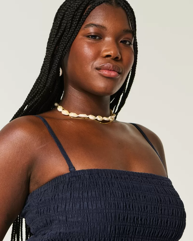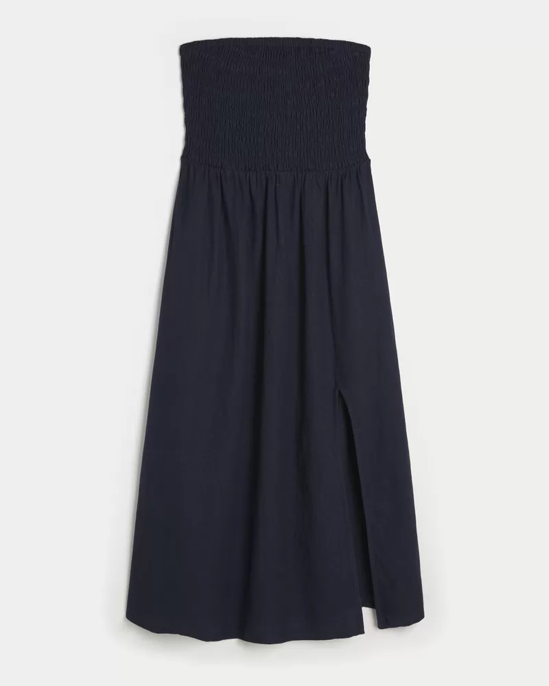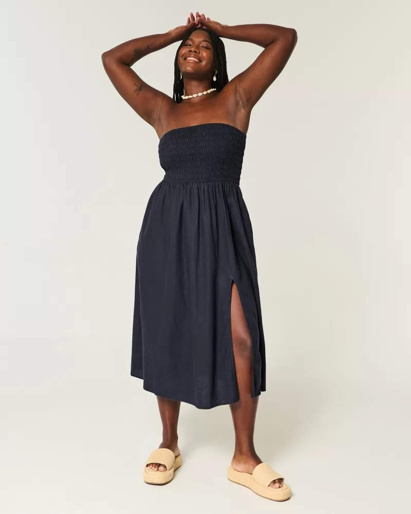 This easy throw-on-and-go strapless dress is designed with a soft smocked bust and midi length. Split hem detail, soft linen-blend fabric, pockets.