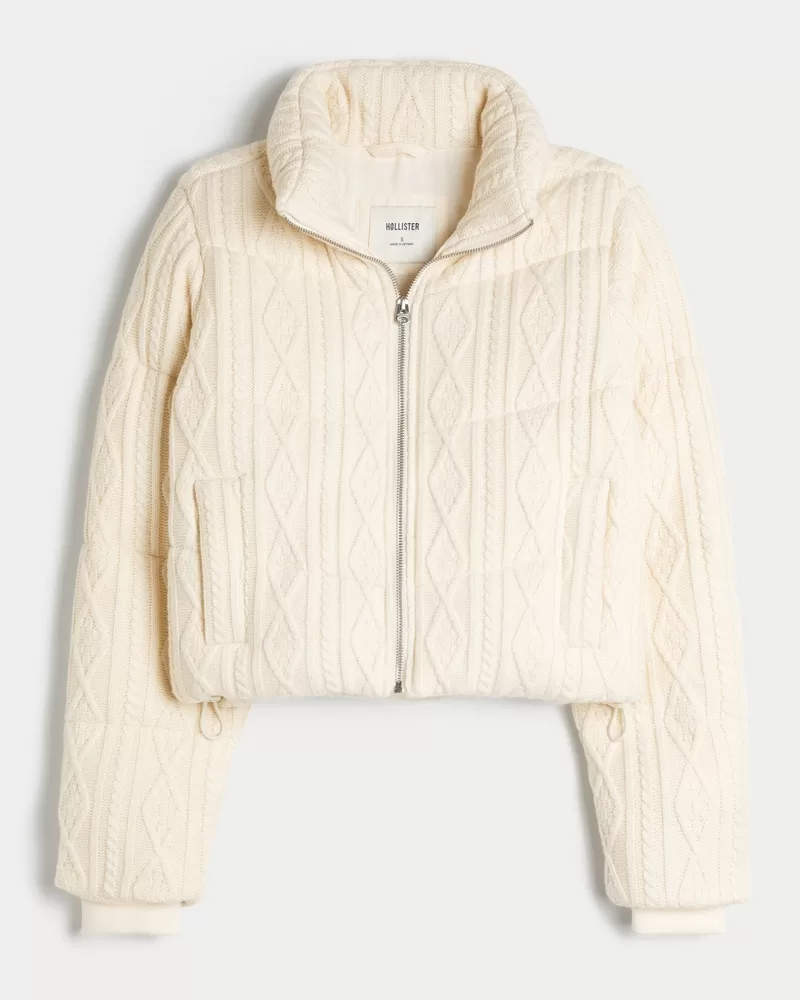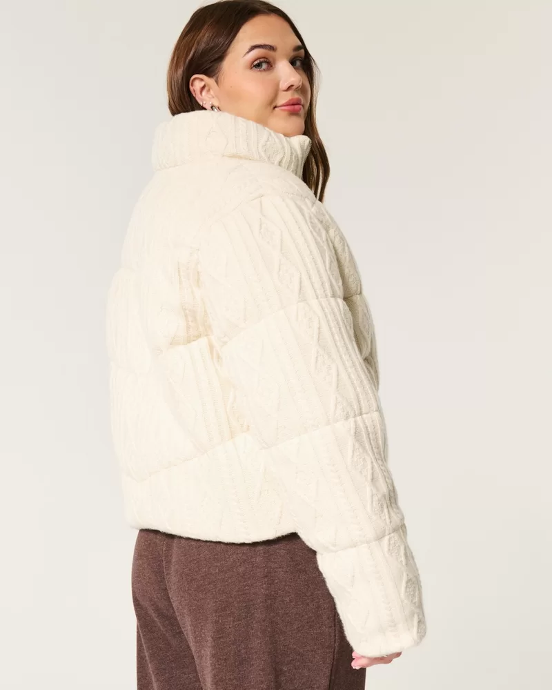 This cute and cozy mini puffer jacket is made with soft sweater-knit fabric with cable-knit patterns and quilted channels. Full zip-up closure, mock-neck collar, pockets, drawcord hem, fully lined, ribbed cuffs.