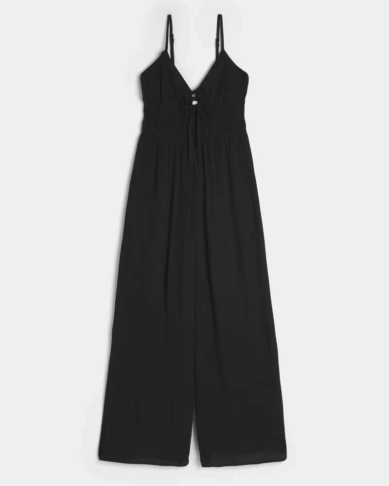 Your new fave jumpsuit features double tie-front details and adjustable straps. Banded waist.