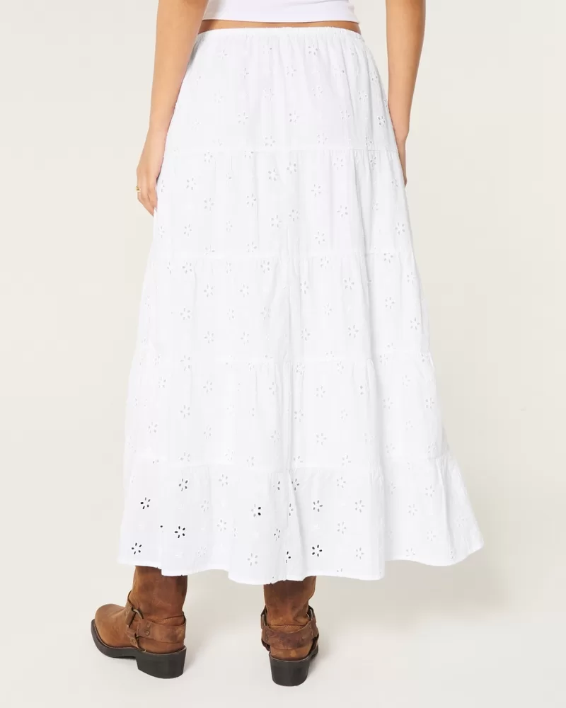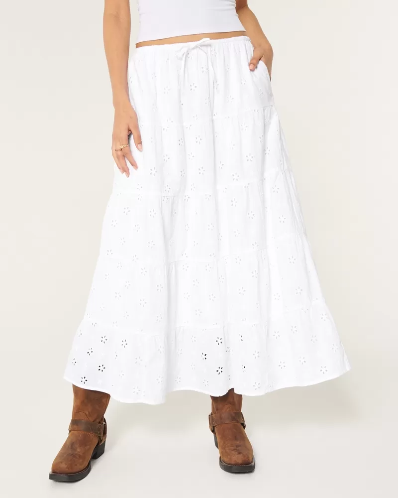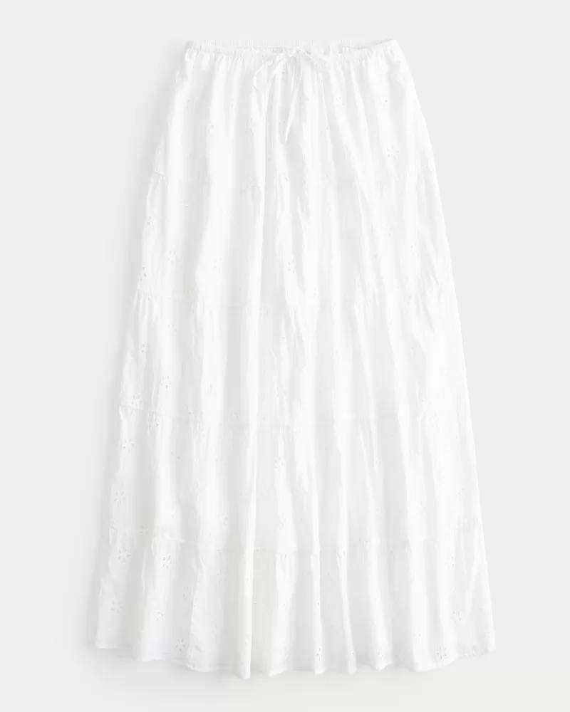Flowy and super soft, this maxi-length skirt is designed with an adjustable-rise drawstring waist. Tiers with all-over eyelet embroidered detailing.