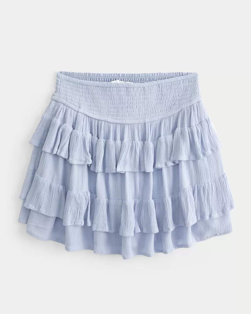 A super soft and pretty mini skort with ruffled tiers and a soft smocked waist. Hidden knit shorts, pocket, ultra high-rise waist.