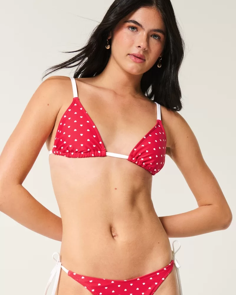 A cute and comfy bikini top with a classic triangle silhouette and over-the-shoulder straps. Tie back closure, adjustable straps, removable padding.