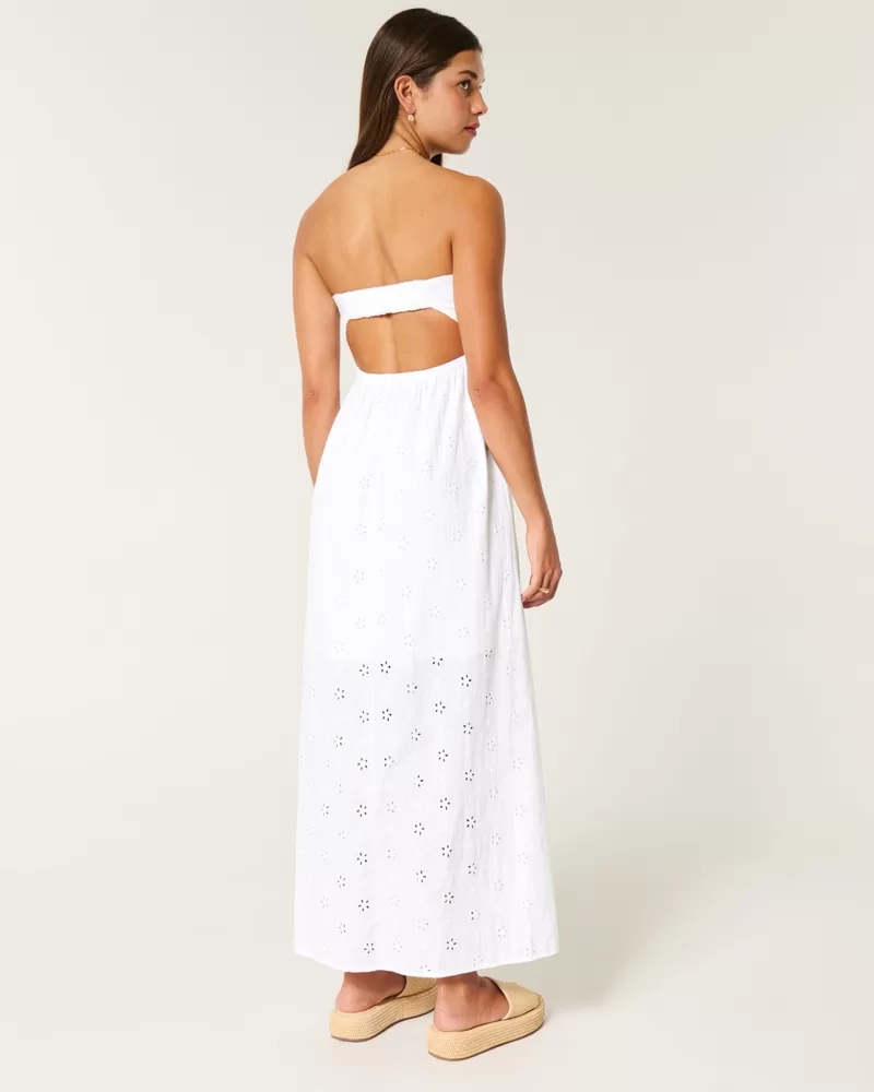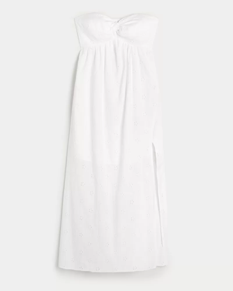 Flowy and super soft, this midi-length features a scrunched back detail, pockets and a split hem detail. Twist bust detail, strapless, all-over eyelet embroidered detailing. Imported.