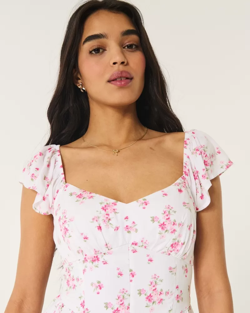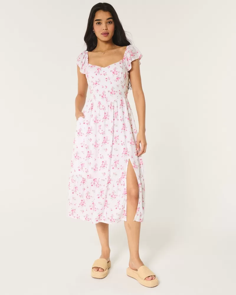 A flowy and super soft midi-length dress with short sleeves and a v-waist detail. Flutter sleeves, split hem detail.