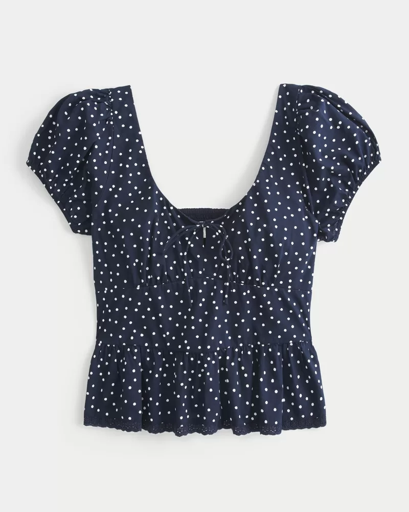 This pretty peplum top is made with soft voile fabric and features a keyhole tie detail. Puff sleeves, smocked back, lace trim details. Looks amazing dressed up or down! Slim Fit.